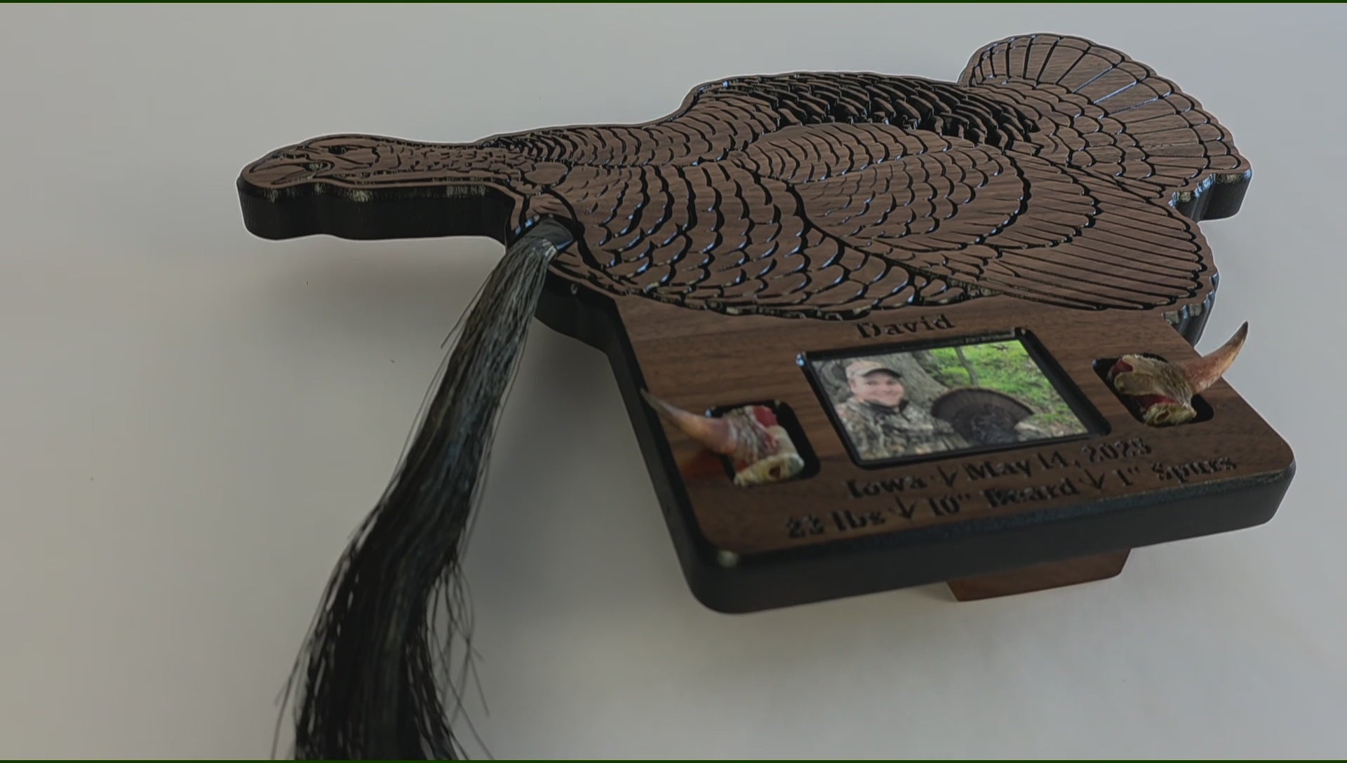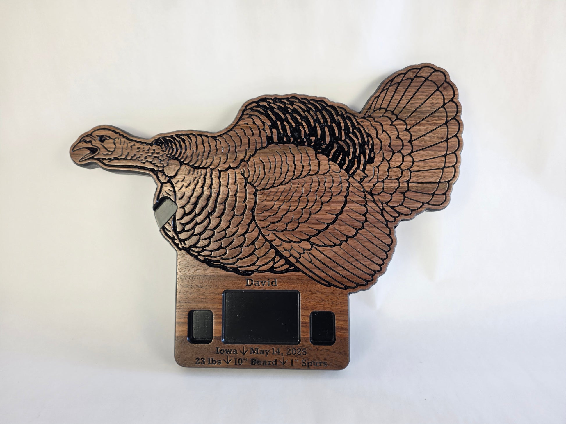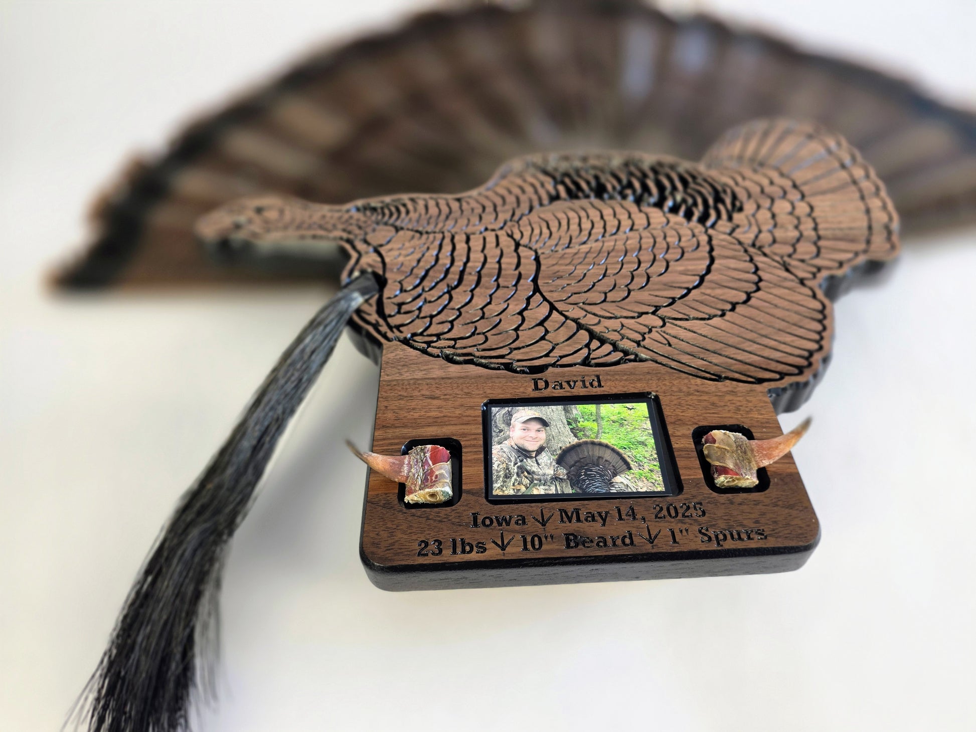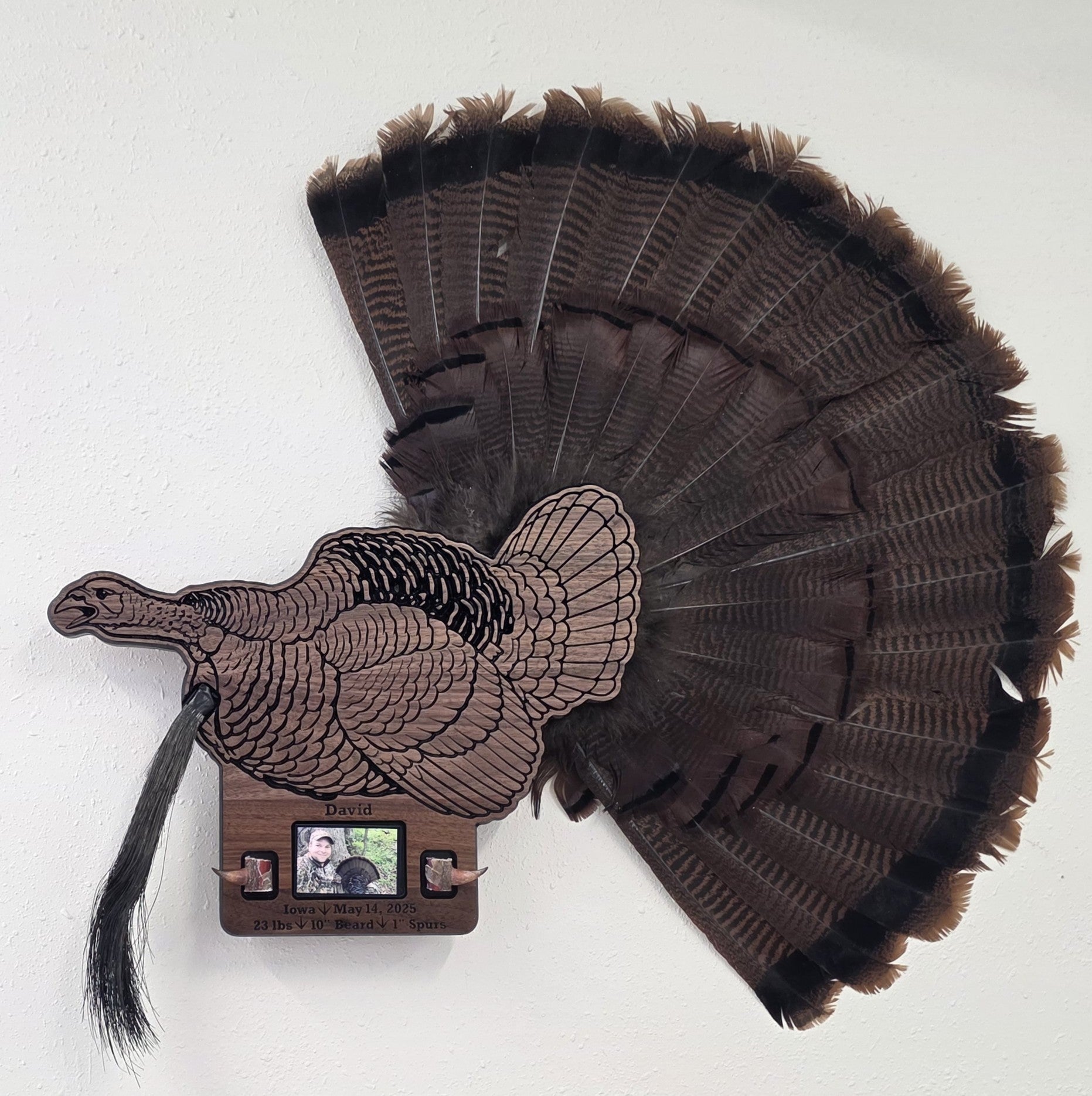 Preserve the memory of your successful spring hunt. This turkey plaque is designed to display a fan, beard, and spurs along with your photo. You can mount the fan above the turkey, behind the turkey, or not use a fan if space is an issue.